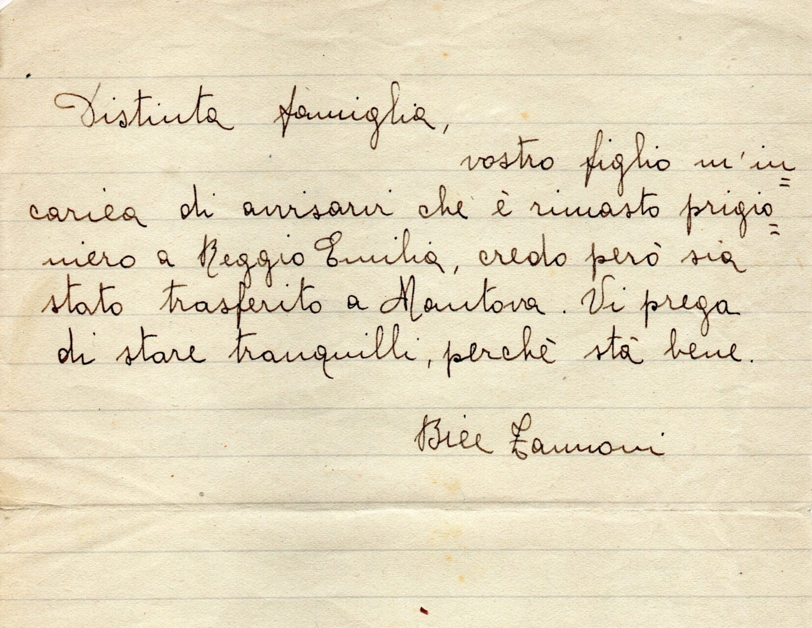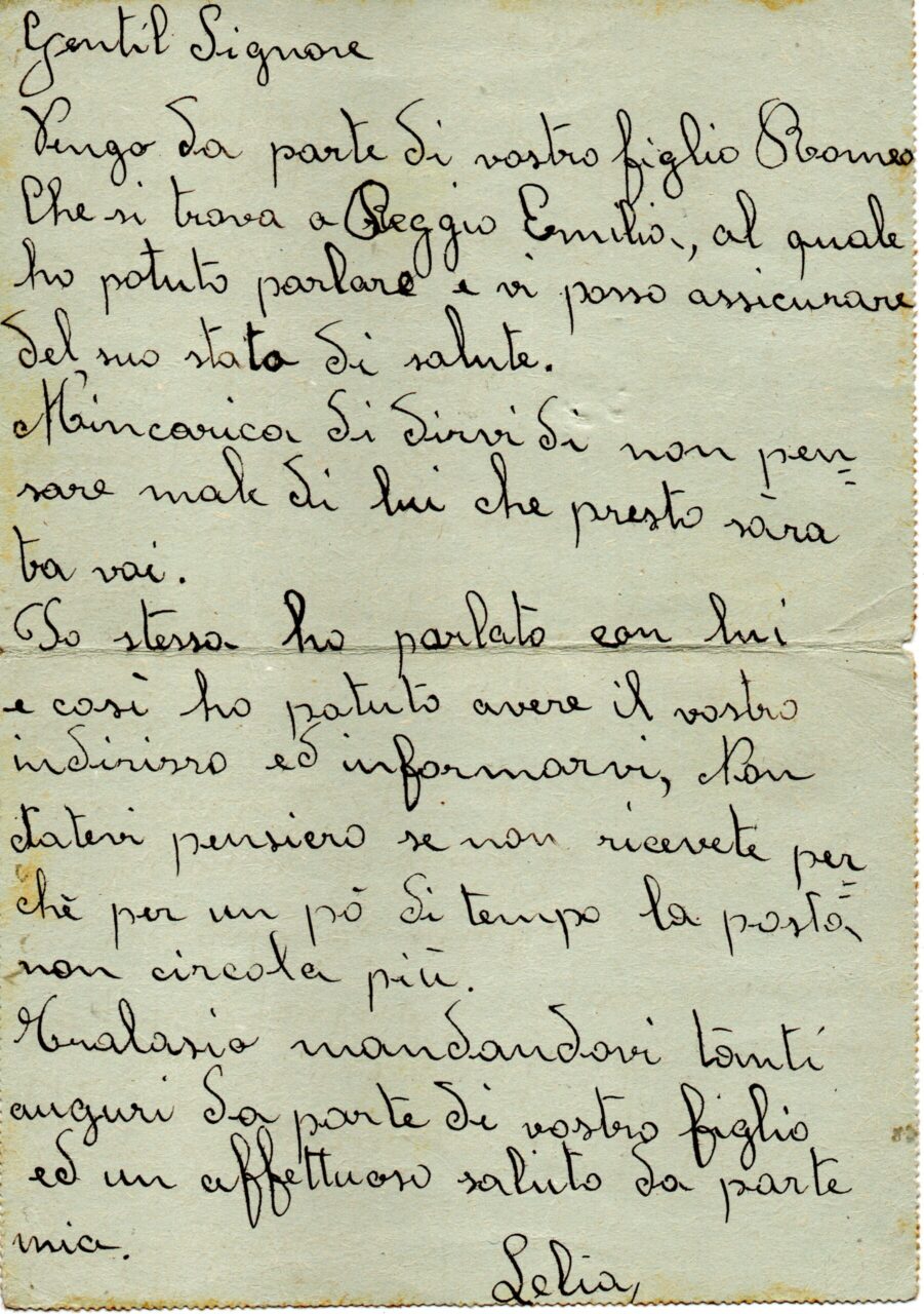 Da questo momento inizia la corrispondenza da detenuto militare, o meglio, I.M.I. (Internato Militare Italiano), che s’interrompe nel gennaio del 1945 con l’ultima cartolina dal campo di Elbing. Da quel momento non si hanno più notizie scritte.