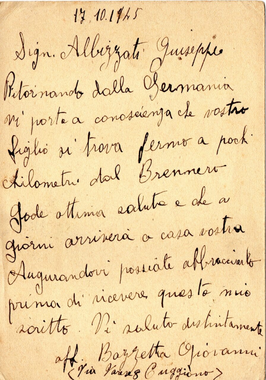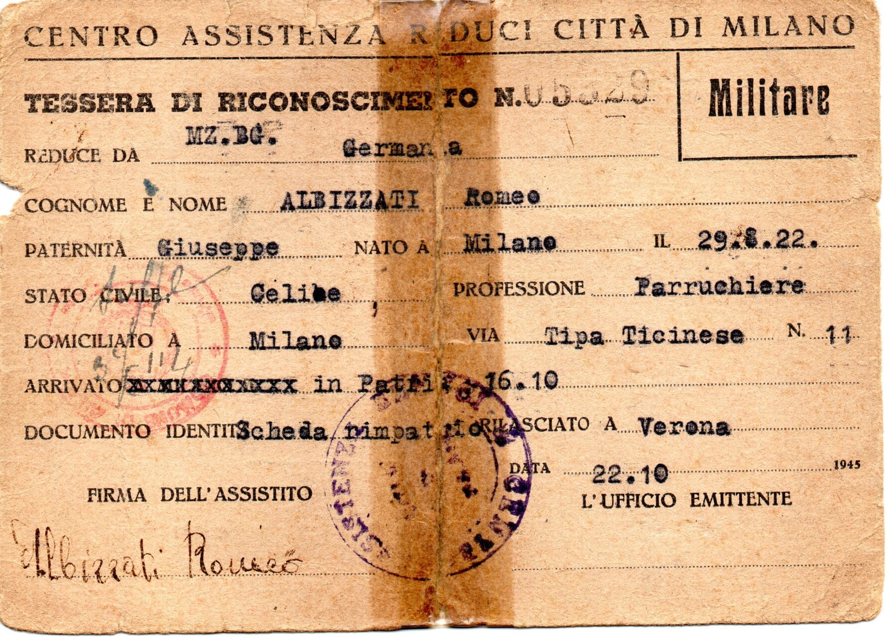 Su Dino Albizzati non ci sono notizie precise, sia riguardo la liberazione dalla prigionia che il percorso di rientro in Italia, si sa solo che arrivò a Verona il 16 ottobre 1945. Restano alcuni documenti che testimoniano la fase dove passa da IMI a “lavoratore libero”, preannunciata da lui stesso nelle ultime corrispondenze con la famiglia.