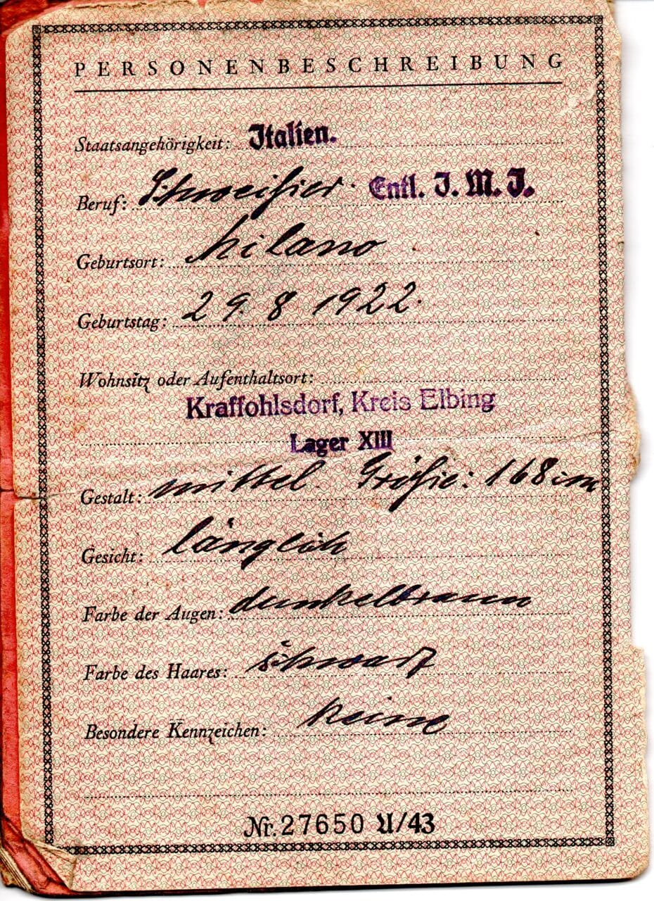 Ad Elbing, suo ultimo campo di detenzione, gli viene fornito un passaporto provvisorio per stranieri. È il 3 gennaio del 1945 e grazie a questo diventa un libero lavoratore. La validità di due anni gli consente anche di circolare all’interno della Germania, desiderio però alquanto remoto.