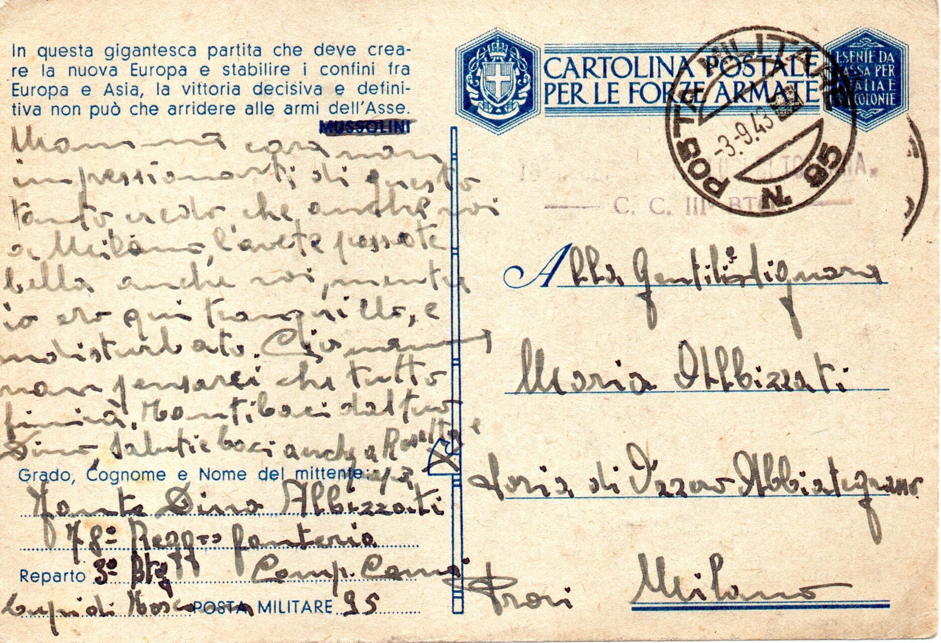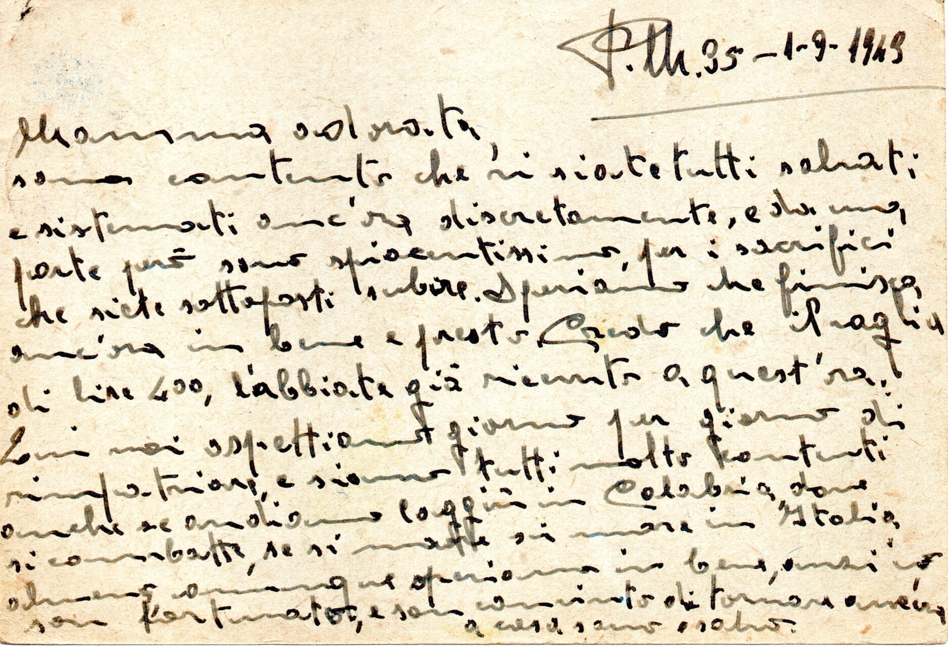 Prima dell’8 settembre Dino è su territorio dichiarato bellico e per la precisione in Francia. Di questo periodo possiamo leggere l’ultima cartolina inviata alla famiglia, molto significativa e che testimonia le sue sensazioni del momento e le aspettative, diverse però da quanto poi si verificò al rientro in patria in seguito all’armistizio dell’8 settembre 1943.